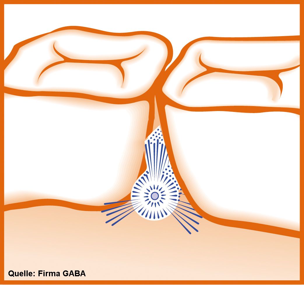 Ein Stiefkind der Mundhygiene, aber mit erheblichen Folgen. Über 80% der Erwachsenen haben Probleme mit dem Zahnfleisch und dies, obwohl sie regelmäßig Zahnpflege betreiben. - Lösung - Reinigung der Zahnraumzwischen- räume mit Zahnraumzwischenbürsten und Zahnseide. Die Skizze zeigt die Anwendung der Zahnraumzwischenbürste. Lassen Sie sich in unserer Praxis über Anwendung und Aus- wahl der richtigen Zahnraumzwischenbürste beraten.